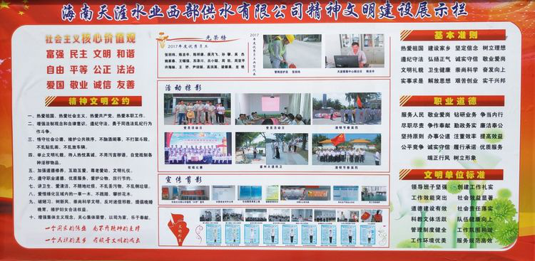 為貫徹落實市委、市政府的統(tǒng)一部署,深入開展助力“創(chuàng)文鞏衛(wèi)”工作,推動“勇當(dāng)先鋒、做好表率”專題活動與全國文明城市創(chuàng)建工作融合發(fā)展,引導(dǎo)和帶動我司全體干部職工參與社會文明大行動,海南天涯水業(yè)(集團(tuán))公司開展“文明交通志愿服務(wù)”和“文明衛(wèi)生行動”主題活動。