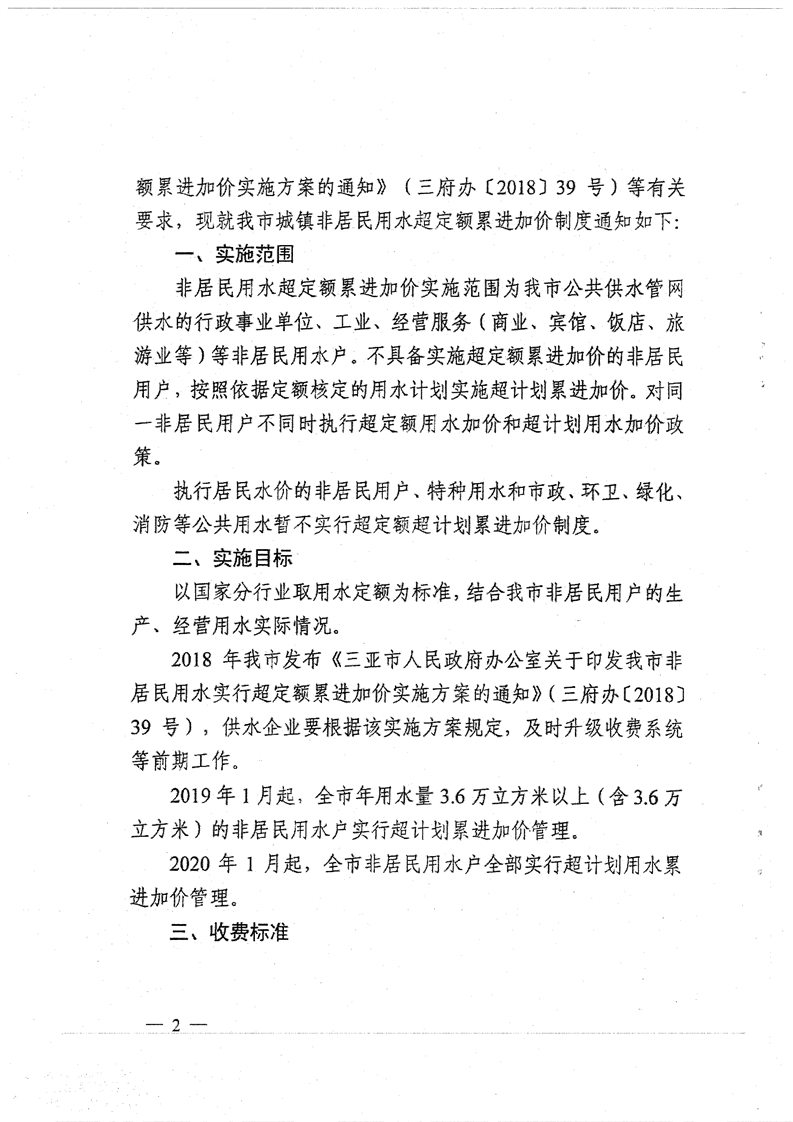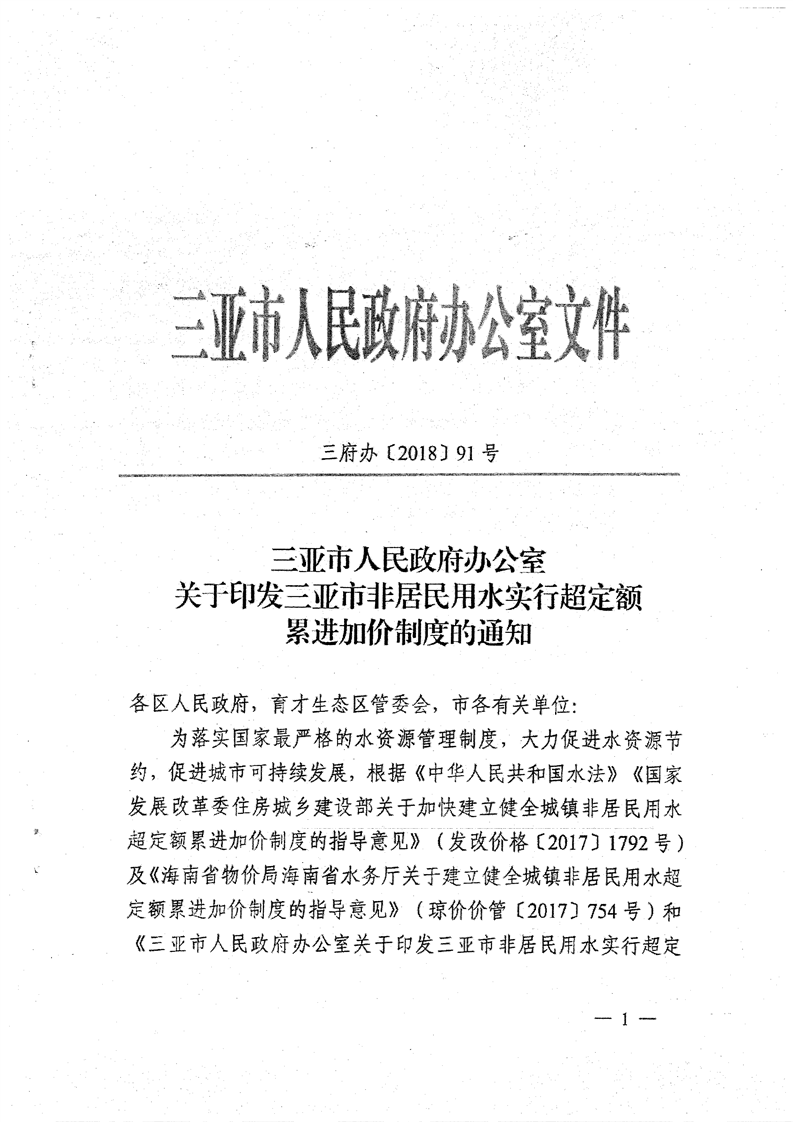 三府辦〔2018〕91號(hào) 關(guān)于印發(fā)三亞市非居民用水實(shí)行超定額累進(jìn)加價(jià)制度到通知